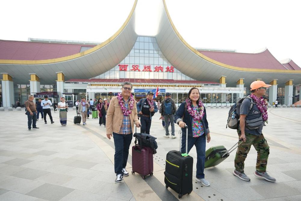 来自老挝、泰国的游客走出中老铁路西双版纳站(2025年2月18日摄)。新华社记者 陈欣波 摄